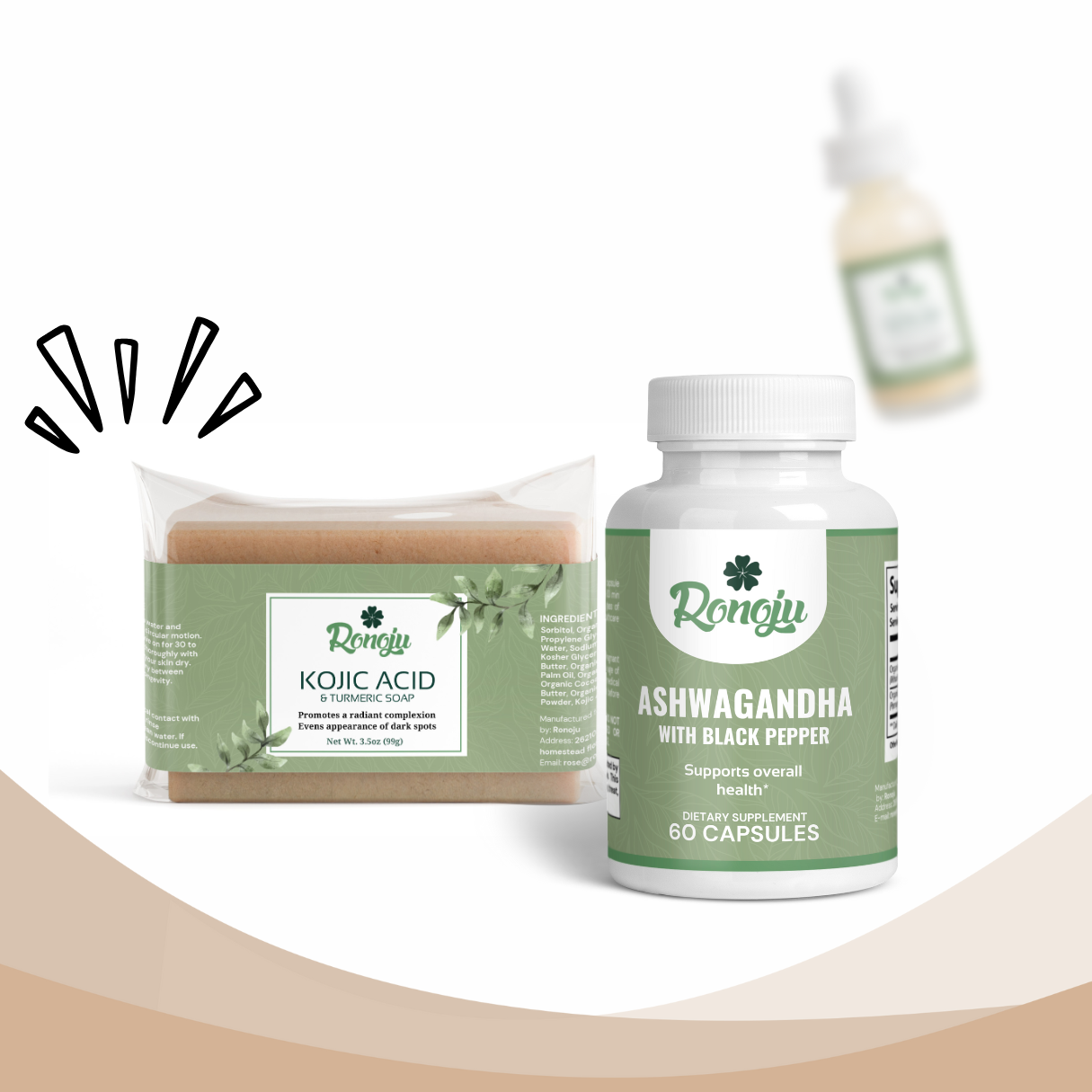 Skincare meets inner wellness! This bundle includes the brightening Kojic Acid Soap, the hydrating Dark Spot Serum, and stress-supporting Ashwagandha supplements. Perfect for a holistic approach to beauty and health.